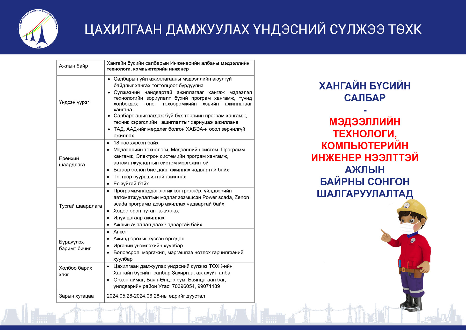 Нээлттэй ажлын байр Хангайн бүсийн салбар - Ээлжийн монтёр
