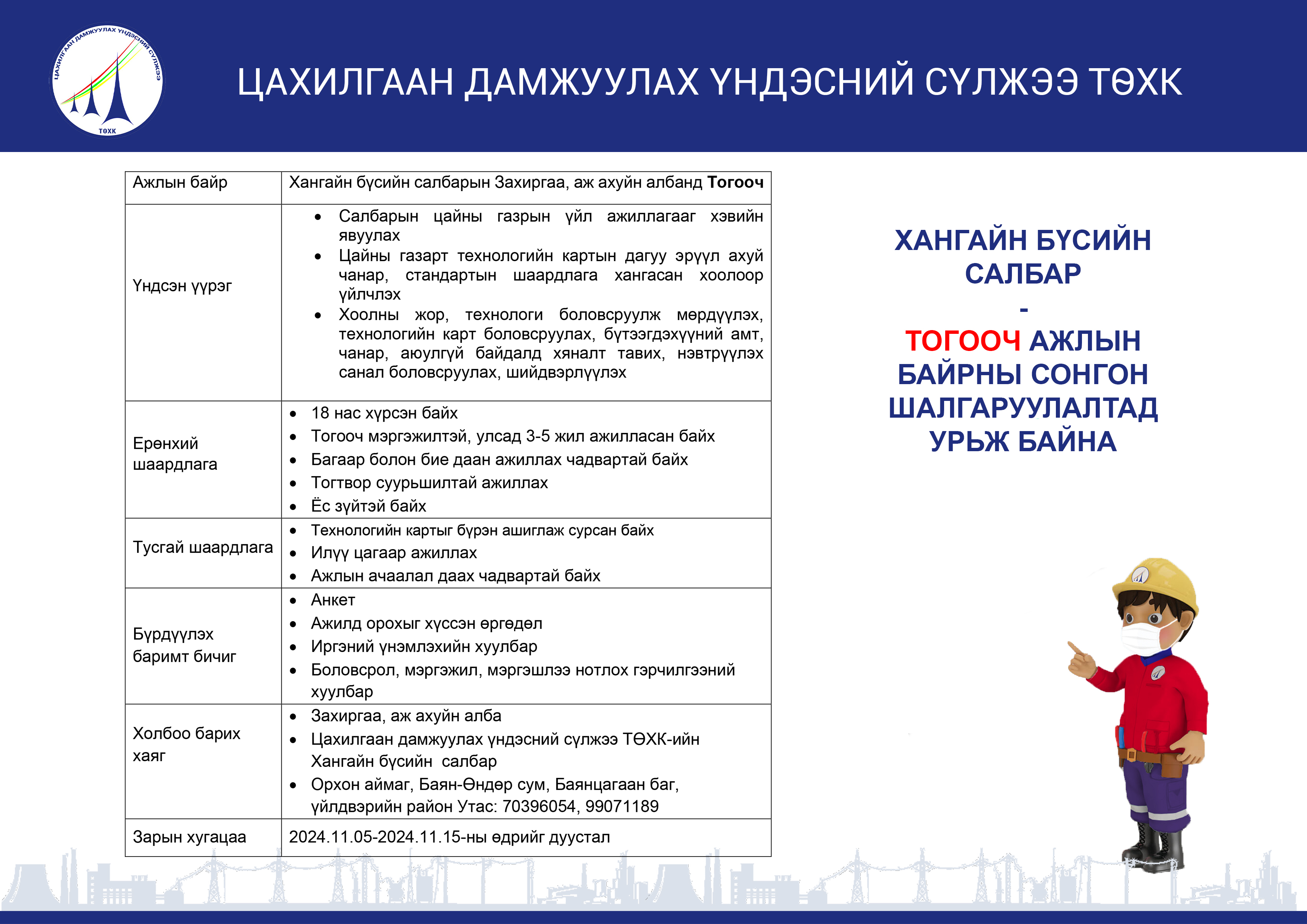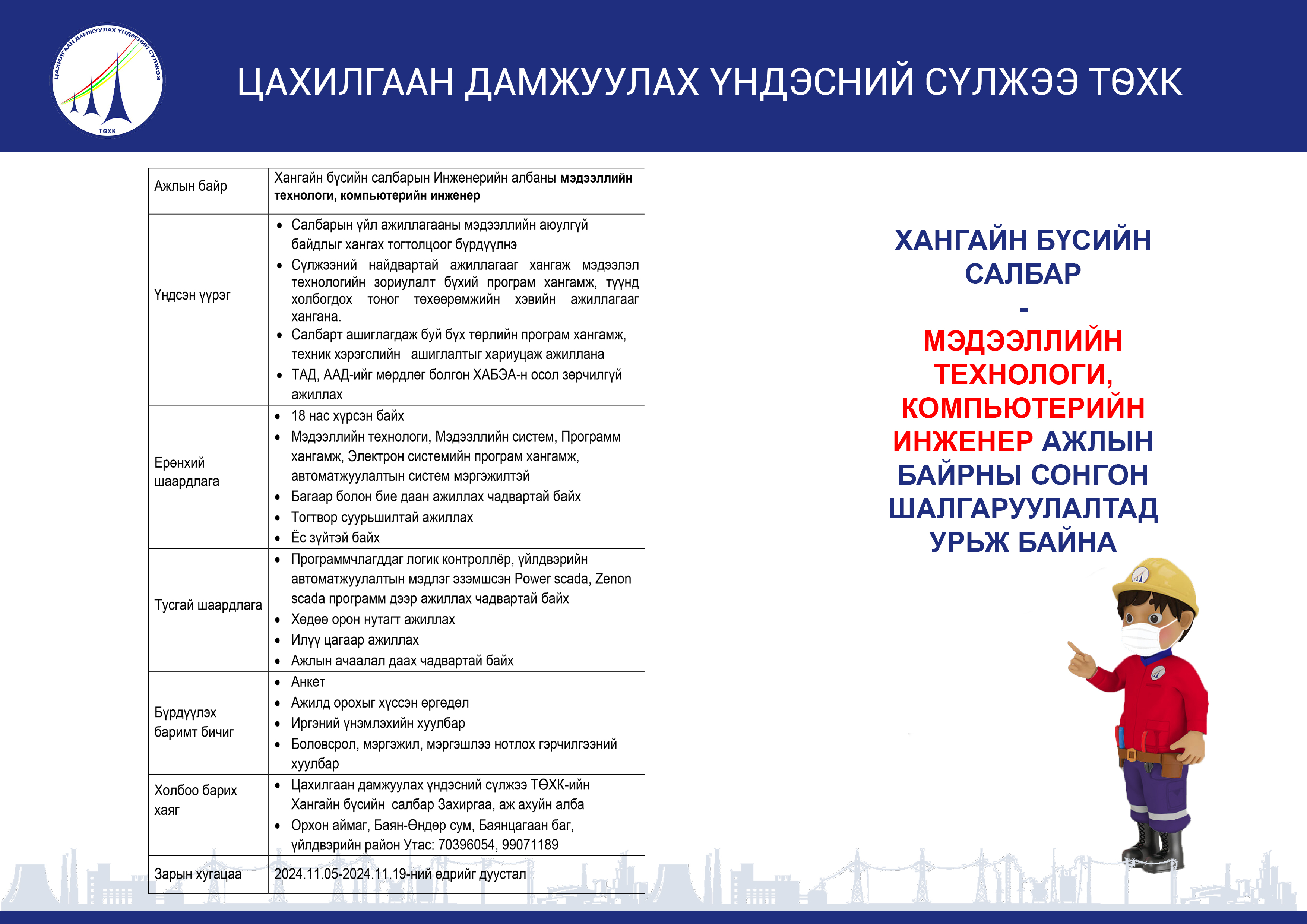 Нээлттэй ажлын байр Төвийн бүсийн салбар - Ээлжийн монтёр